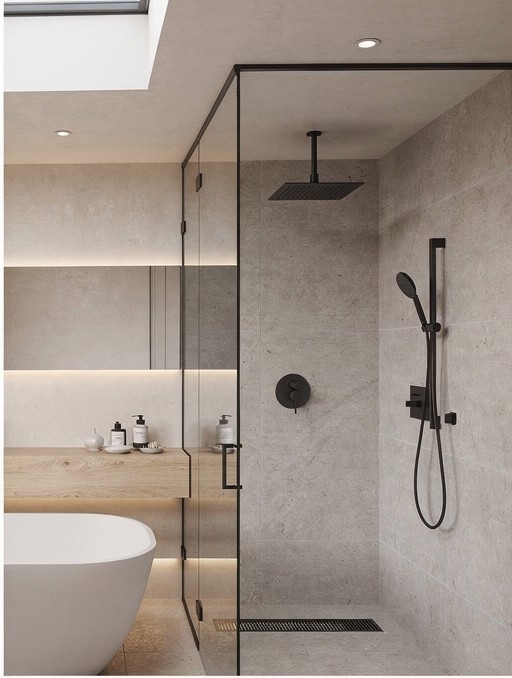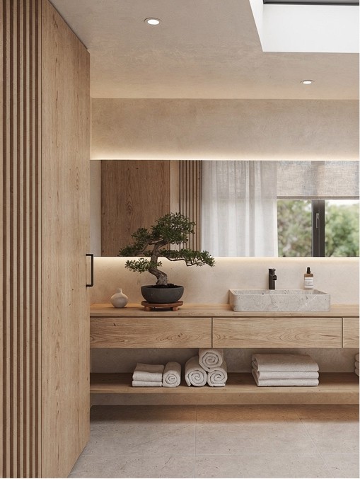 Łazienka: Oczyszczający Rytuał Salon kąpielowy to miejsce, gdzie woda spotyka się z ciepłem natury. Szeroki, drewniany blat podtrzymuje kamienną umywalkę, a obecność miniaturowego drzewka bonsai przypomina o wiecznej więzi z ziemią. Wolnostojąca wanna, ustawiona na tle jasnych kafli i delikatnych firan, obiecuje relaks, który wykracza poza zwykłą kąpiel. Minimalistyczna strefa prysznica z czarnymi akcentami armatury dodaje całości wyrazistego, nowoczesnego sznytu.