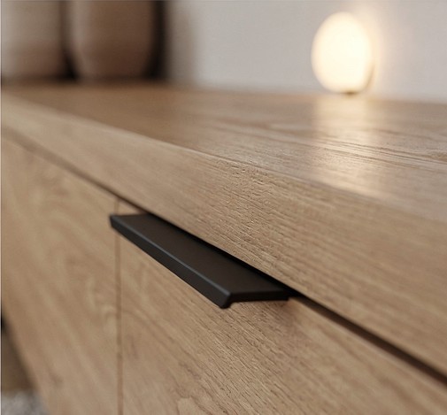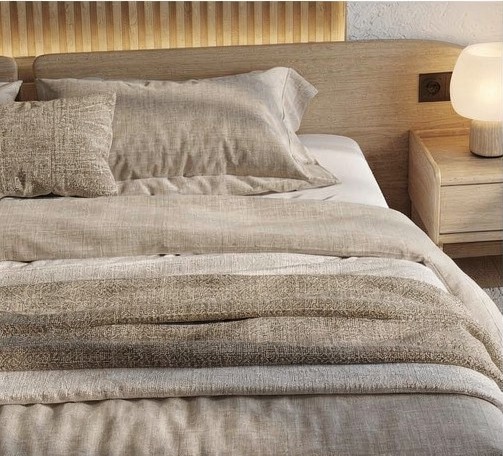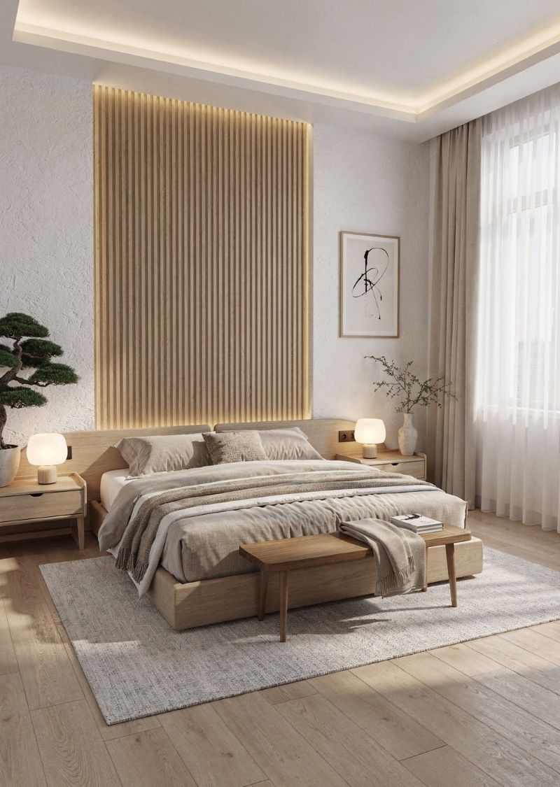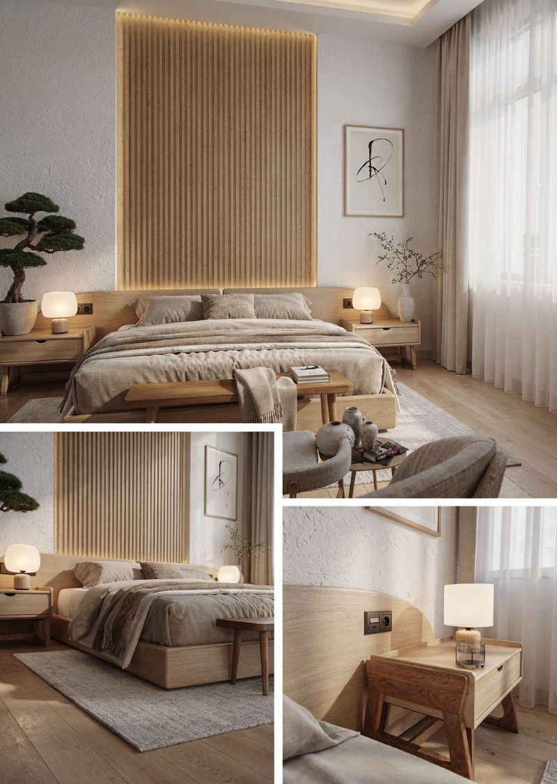 Sypialnia: Miękkość Poranka Sypialnia to sanktuarium odpoczynku. Pionowe lamele za wezgłowiem łóżka wprowadzają rytm i pion, a delikatne, kuliste lampy rzucają miękki blask na lnianą pościel. To tutaj zapach drewna miesza się ze świeżością porannego powietrza wpadającego przez wysokie okna przesłonięte zwiewnymi tkaninami.