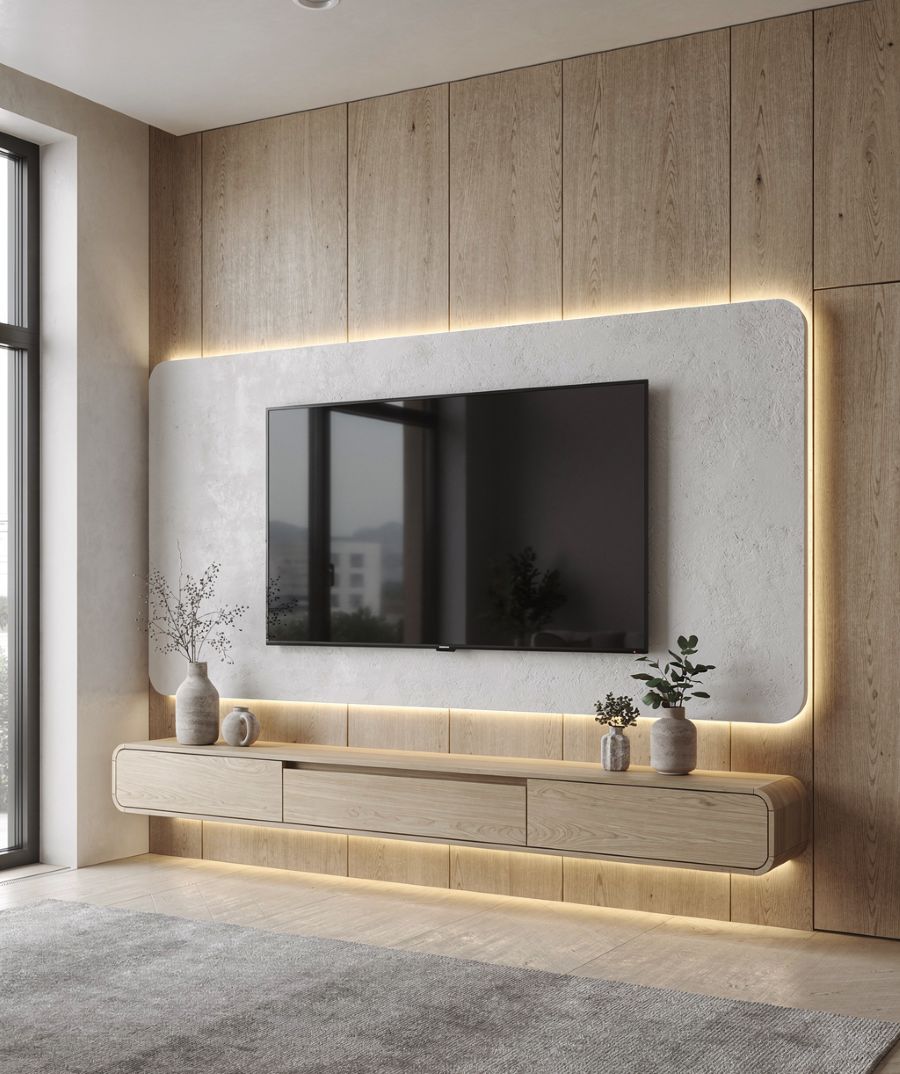 Salon i Kuchnia: Harmonia Codzienności Salon to oaza świetlistości, w której jasna podłoga prowadzi wzrok ku miękkiej, szarej sofie i finezyjnym dodatkom z drewna. Ściana telewizyjna, oprawiona w dębowe panele z subtelnym podświetleniem, wygląda niczym nowoczesna rzeźba. W kuchni panuje niemal klasztorna czystość formy - gładkie, drewniane fronty i wyspa o ciepłym odcieniu tworzą przestrzeń, w której gotowanie staje się medytacją.