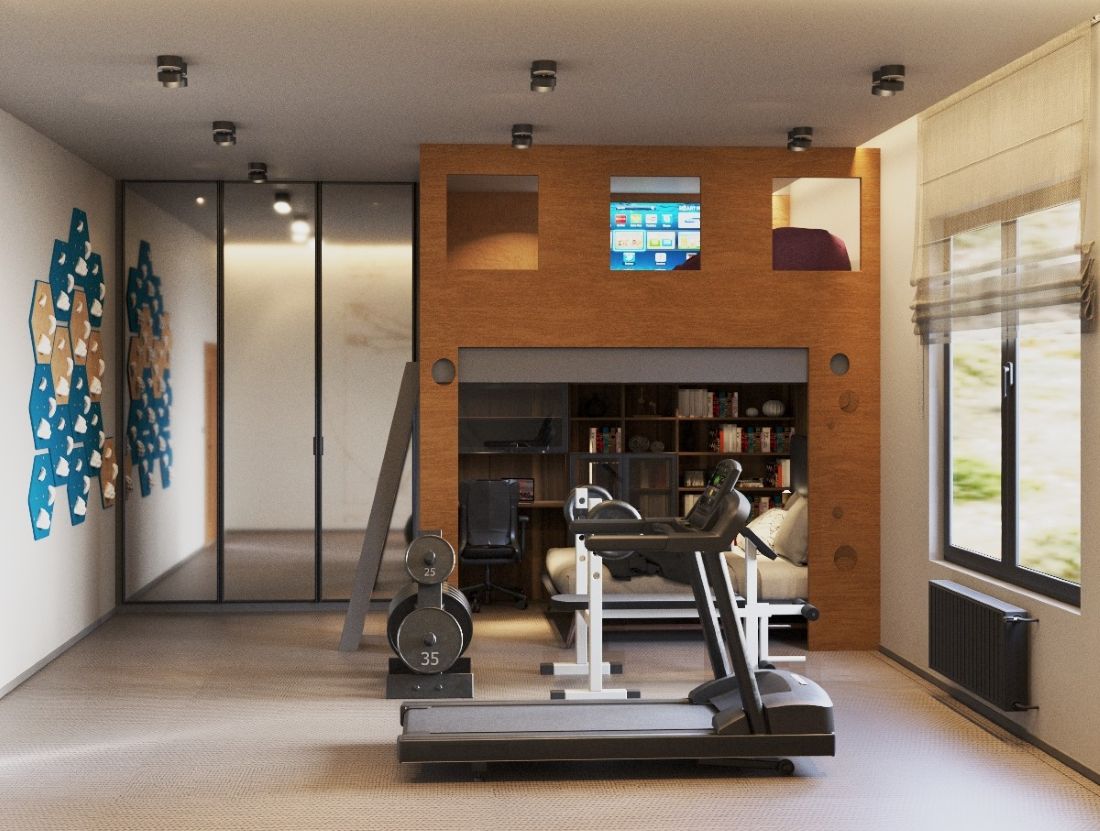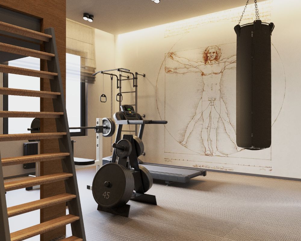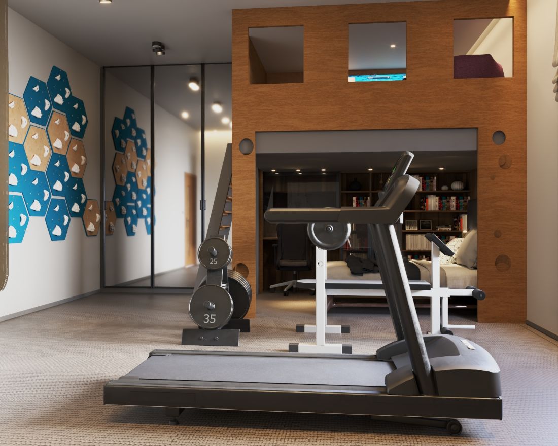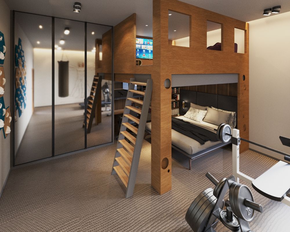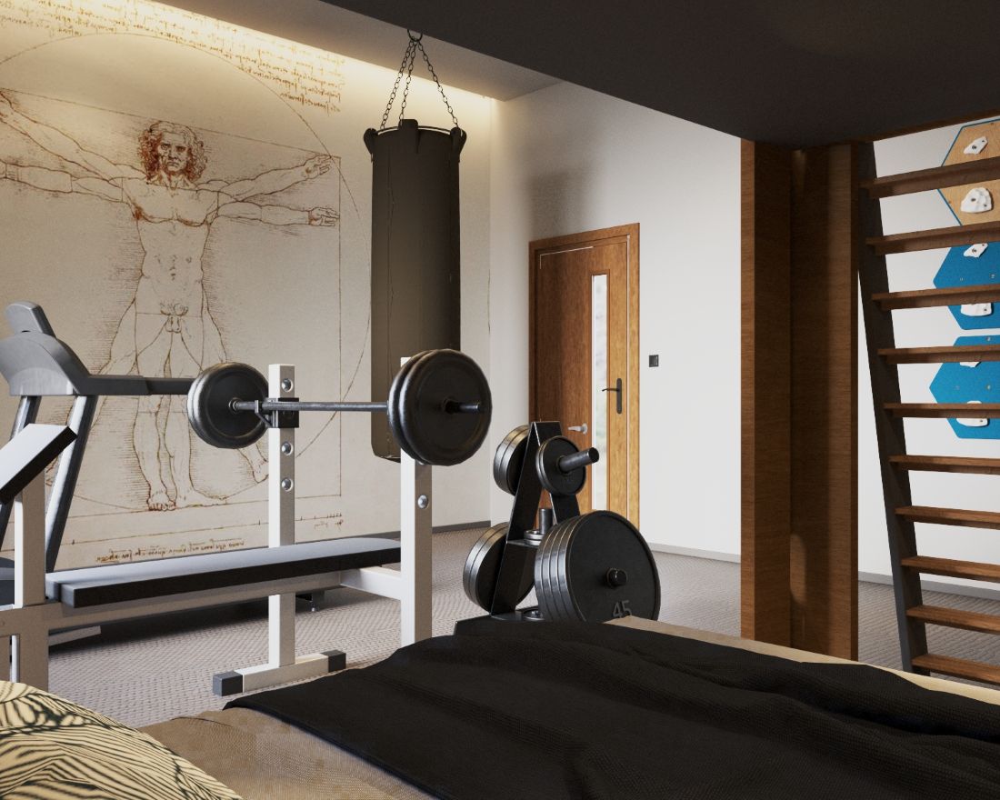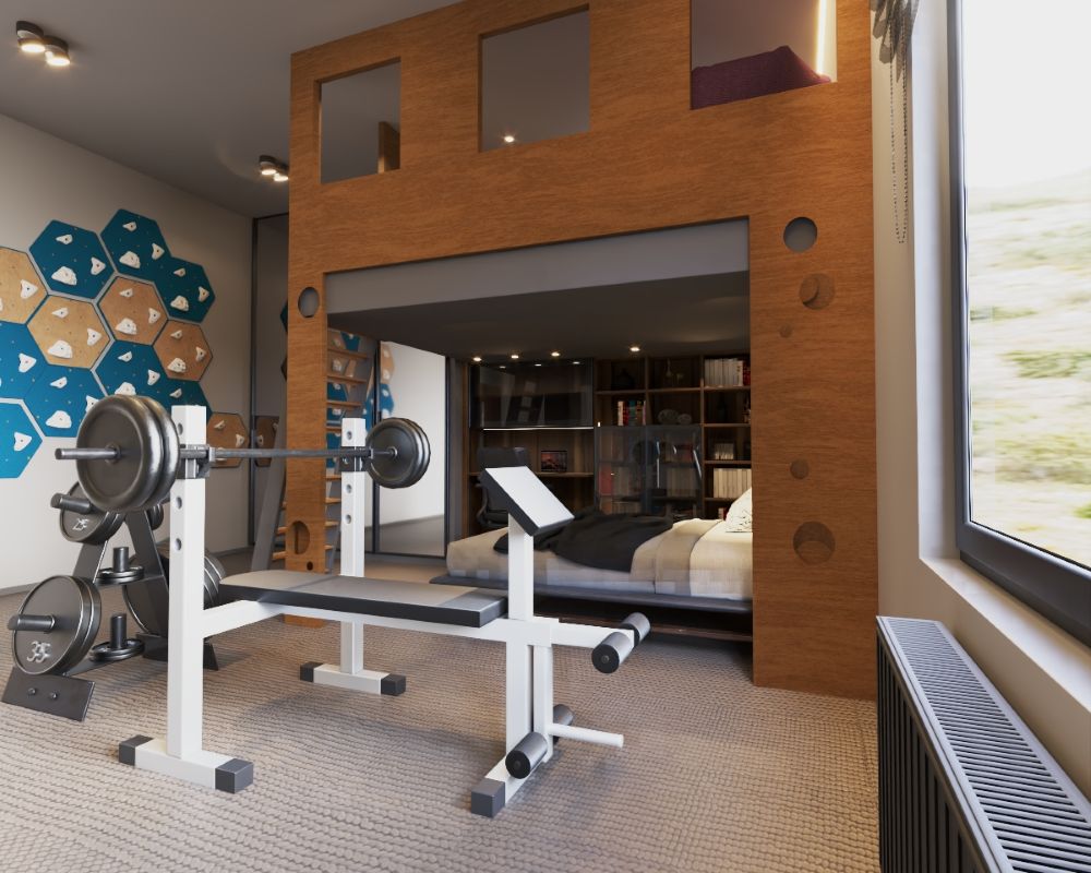Pozostawienie otwartej przestrzeni na sprzęt sportowy - od bieżni po worek bokserski - definiuje charakter mieszkańca. To nie jest pokój dla kogoś, kto tylko siedzi przed ekranem.