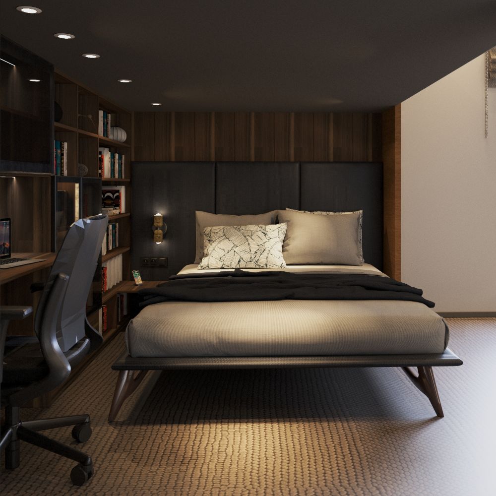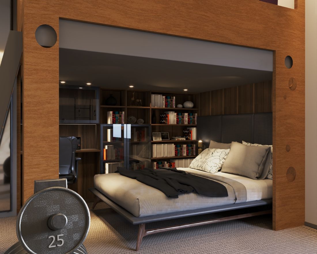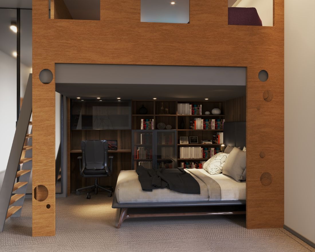 Dół (Fundament Spokoju): Duże łóżko pod antresolą tworzy przytulną, niemal jaskiniową atmosferę sprzyjającą głębokiemu wypoczynkowi. Integracja regału z biurkiem to majstersztyk ergonomii - wiedza i praca są tu dosłownie na wyciągnięcie ręki, wplecione w strukturę mebla.