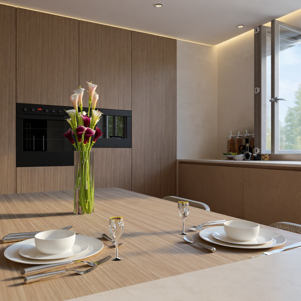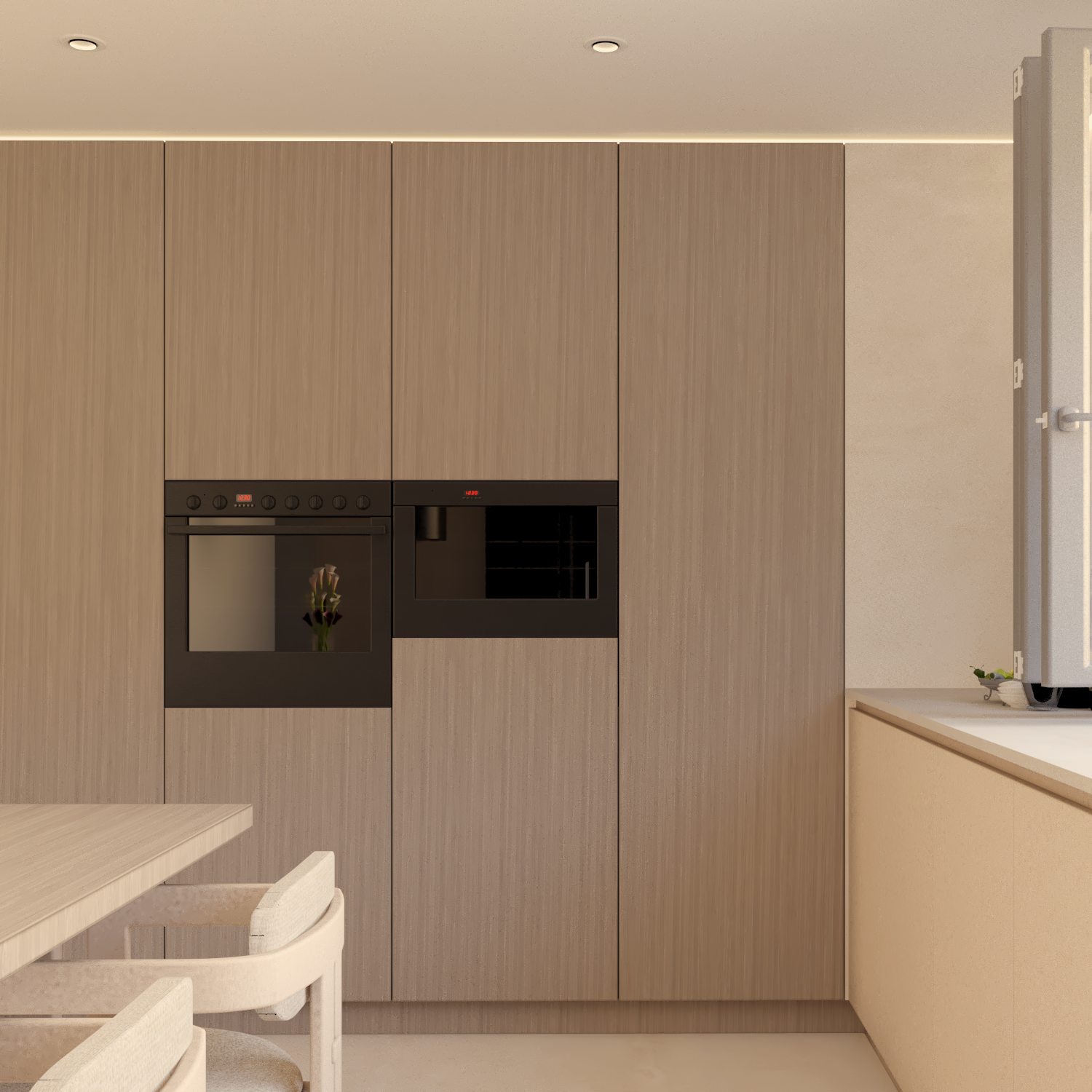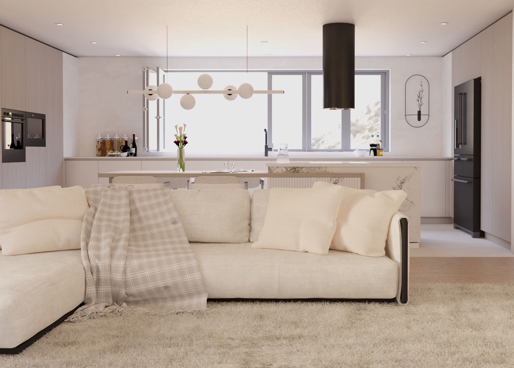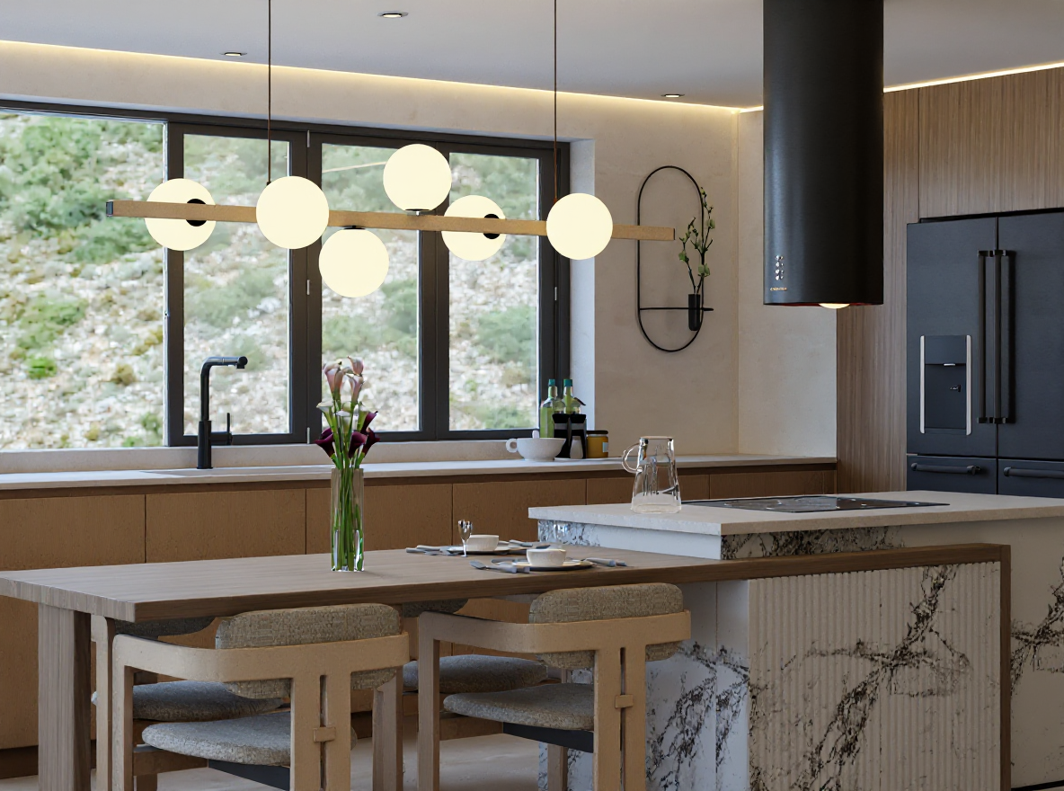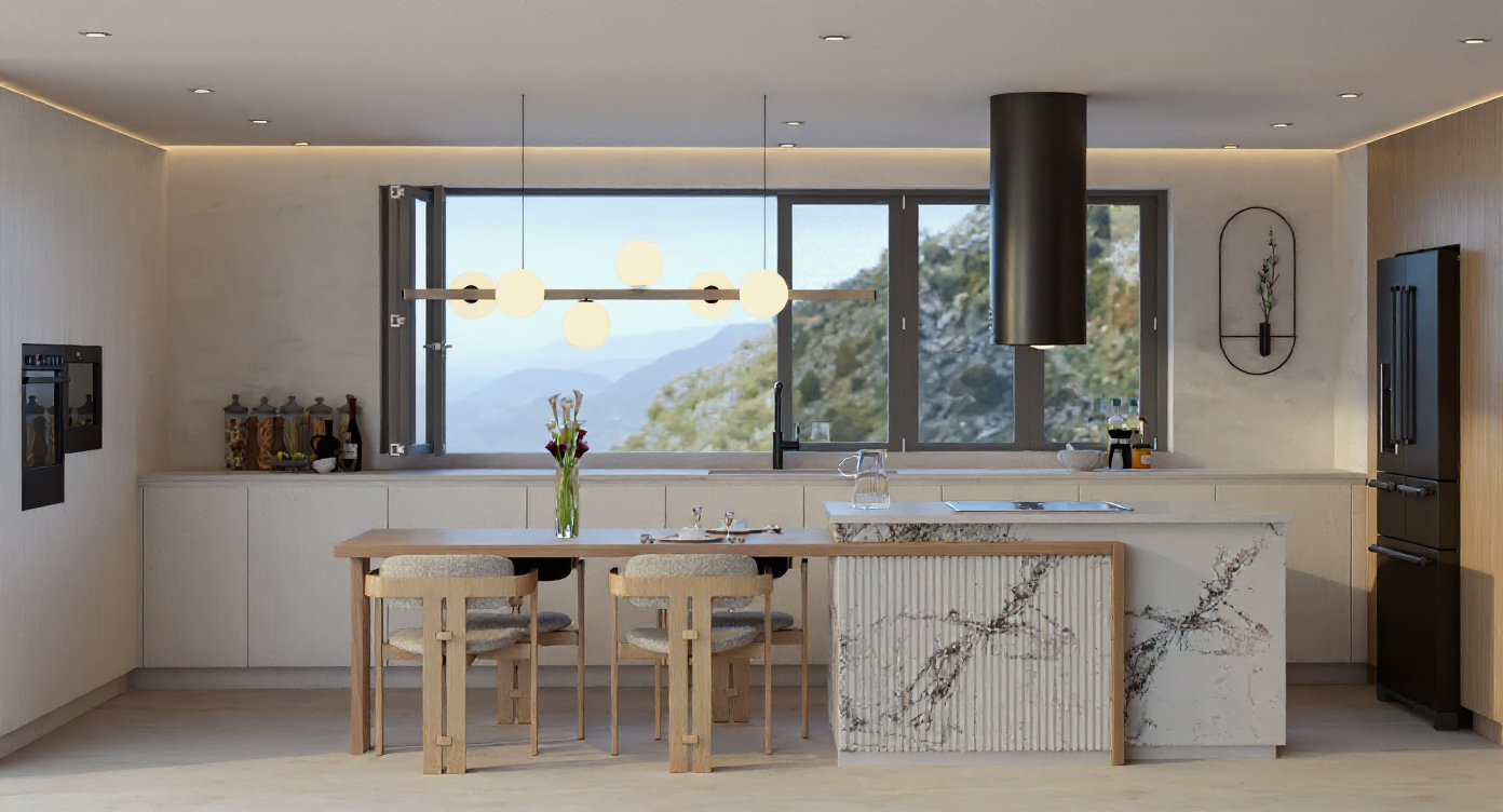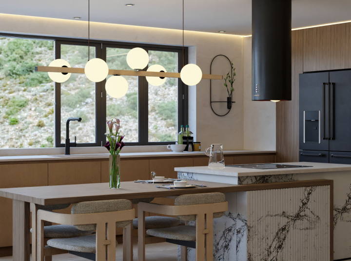 Kluczem do sukcesu okazało się postawienie na naturalne materiały i stonowaną paletę barw, opartą o ciepłe odcienie beżu i jasnego drewna. To podejście pozwoliło nam na stworzenie przestrzeni, która jest niczym czyste płótno, idealne do życia i odpoczynku. Zamiast nadmiaru ozdobników, postawiliśmy na grę strukturą i fakturą, która dodaje wnętrzu subtelnej dynamiki. Serce domu to bez wątpienia przestronny salon z otwartą kuchnią, będący świadectwem naszego podejścia do łączenia funkcjonalności z luksusem. Wyspa kuchenna, połączona z jadalnianym stołem, staje się centralnym punktem spotkań, gdzie gotowanie to czysta przyjemność, a design zachwyca swoją prostotą i wyrafinowaniem. Kamienne blaty w duecie z ciepłym drewnem i dekoracyjnymi płytkami na podłodze tworzą spójną i elegancką całość, a duża ilość miejsca do przechowywania ukryta w minimalistycznej zabudowie zapewnia idealny porządek.