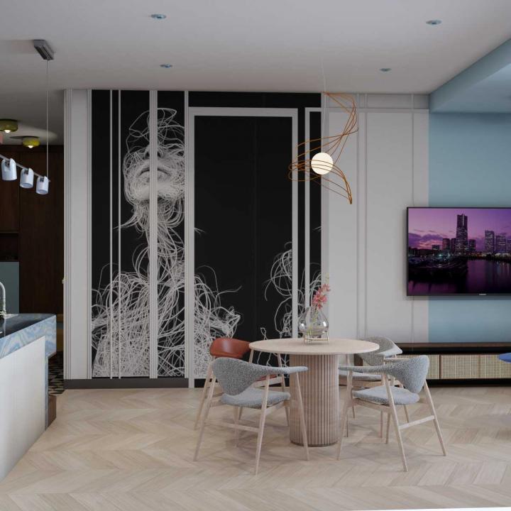 Serce mieszkania to bez wątpienia przestronny salon z otwartą kuchnią. Ta strefa jest świadectwem naszego podejścia do łączenia funkcjonalności z luksusem. Kuchnia, wykonana z eleganckiego forniru i szlachetnego kamienia naturalnego, staje się centralnym punktem spotkań, gdzie gotowanie to czysta przyjemność, a design zachwyca swoją prostotą i wyrafinowaniem.