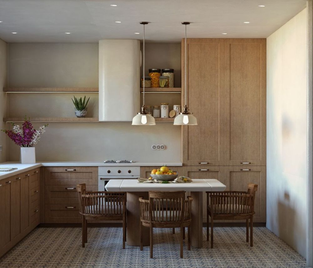 Sercem tego wnętrza jest harmonia i szacunek dla materiału. Ściany pokrywa wapienny tynk, nadając im ciepłą, naturalną fakturę, która zdaje się oddychać. Na podłodze króluje ciepłe drewno, wprowadzające do każdego zakątka autentyczność i przyjemność, które czuć pod stopami. Kamień powraca w formie blatu kuchennego i akcentów w łazience, a jego chłód zderza się z miękkością naturalnych tkanin, takich jak wełna, len i bawełna, które otulają przestrzeń.