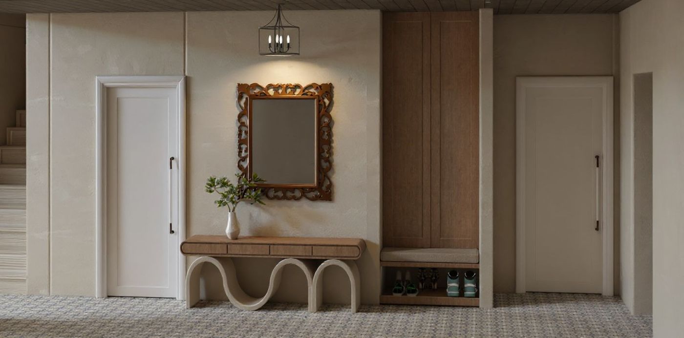 Kuchnia, choć nowoczesna, pozostaje wierna surowej elegancji. Minimalistyczna zabudowa, ukrywająca chaos codzienności, została zaprojektowana tak, aby nie przytłaczać, lecz stać się tłem dla sztuki gotowania. W korytarzu wita nas prosta, dyskretna przestrzeń, która zapowiada spójną i spokojną narrację całego wnętrza.